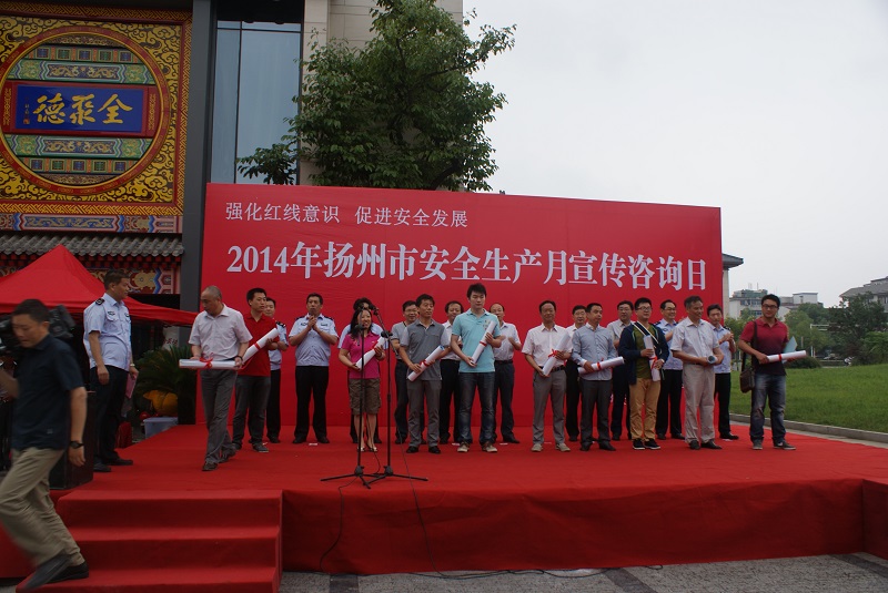 6月16日上午,揚(yáng)州市安委辦會(huì)同蜀崗—瘦西湖風(fēng)景名勝區(qū)管委會(huì)在虹橋坊舉行了以“強(qiáng)化紅線意識(shí),促進(jìn)安全發(fā)展”為主題的2014年揚(yáng)州市“安全生產(chǎn)月”宣傳咨詢(xún)?nèi)栈顒?dòng)。市安委會(huì)、市安監(jiān)局、蜀岡—瘦西湖風(fēng)景名勝區(qū)管委會(huì)、市人保公司負(fù)責(zé)人出席了活動(dòng)。市安監(jiān)局、揚(yáng)汽集團(tuán)、市城建控股集團(tuán)、市工藝美術(shù)集團(tuán)、金茂化工集團(tuán)、揚(yáng)子江集團(tuán)、建工控股集團(tuán)等11家單位以及消防、建筑、燃?xì)狻庀、質(zhì)監(jiān)、部分駐揚(yáng)單位的職工代表共計(jì)400余人參加了活動(dòng)。