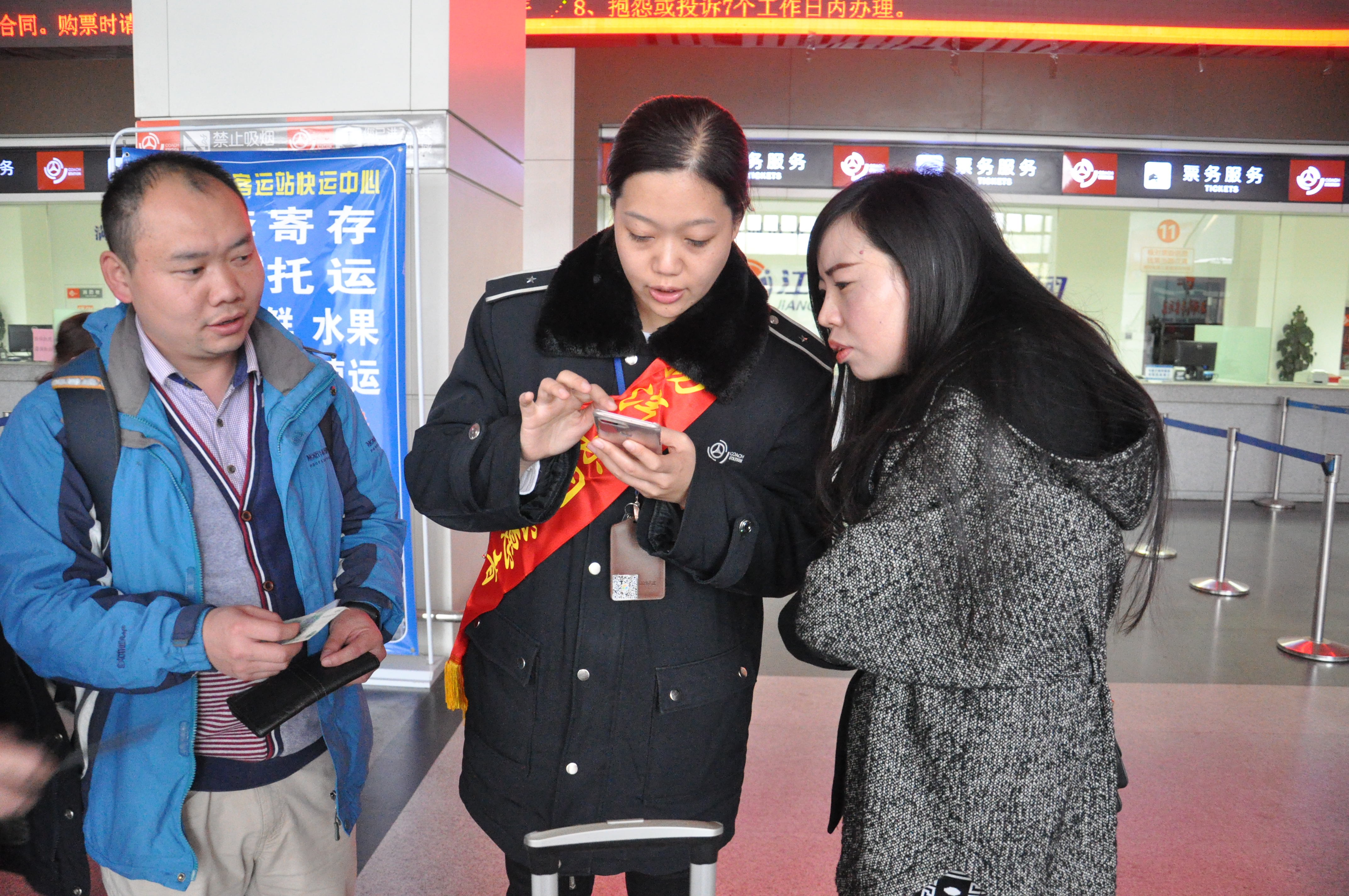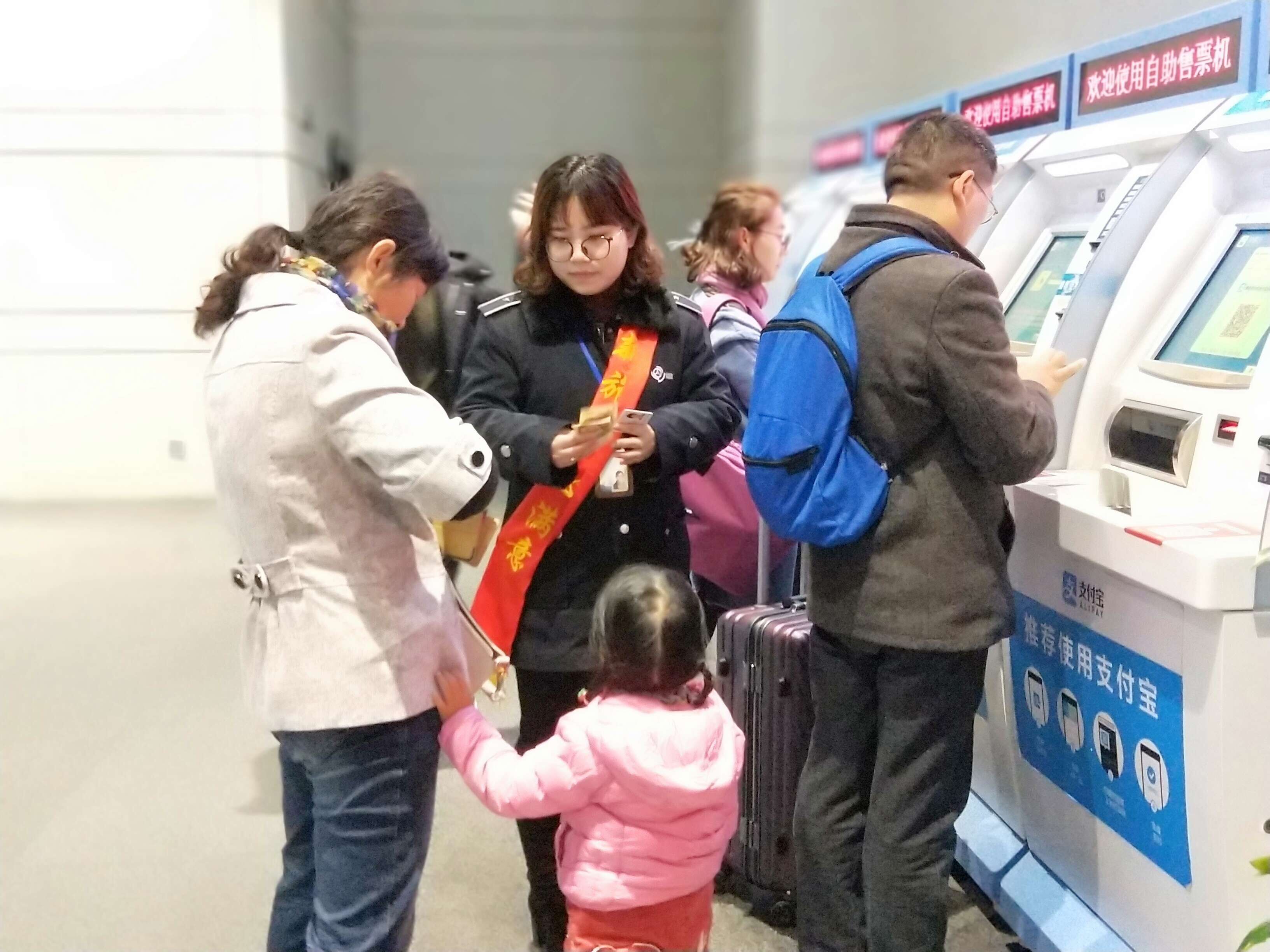 在售票大廳里,有一支身披“新旅途 心滿意”綬帶的工作人員隊伍,正在有條不紊地引導(dǎo)著前來購票的旅客,通過手機或者自助機的形式進(jìn)行購票。原來,車站現(xiàn)場按照站長室近期重點工作的部署,主動在客流放緩的情況下有序進(jìn)行售票自助化、智能化的嘗試。下午3點現(xiàn)場除退票窗口外,其余窗口臨時停售,售票員紛紛走出售票窗口,將導(dǎo)乘、購票功能前置。