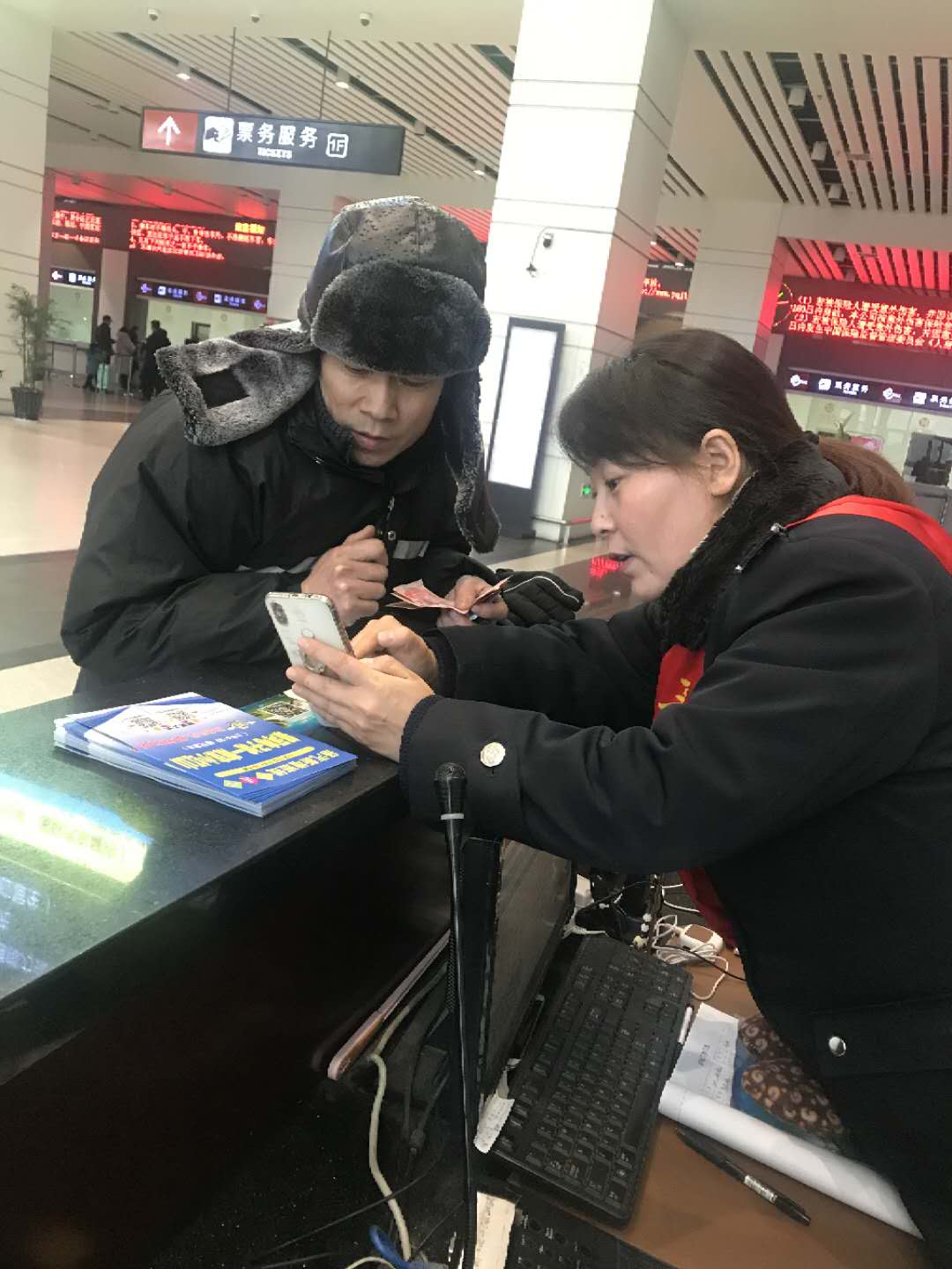 農(nóng)民工兄弟頂風冒雨購票回家,站務員熱心相幫助他們返鄉(xiāng)
