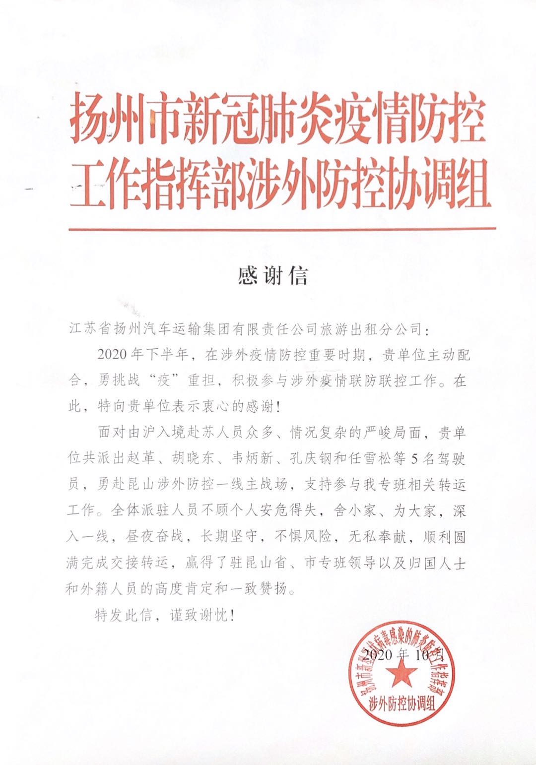 十月下旬,一封承載著市疫情防控指揮部贊譽的感謝信送至旅游出租分公司。疫情防控指揮部對第二批參加境外返揚人員轉運工作的五名駕駛員給予了高度評價,信中表示,他們在昆山涉外防控一線,長期堅守,晝夜奮戰(zhàn),不懼風險,無私奉獻,順利圓滿完成交接轉運,贏得市專班領導以及歸國人士和外籍人員的高度肯定和一致贊揚。