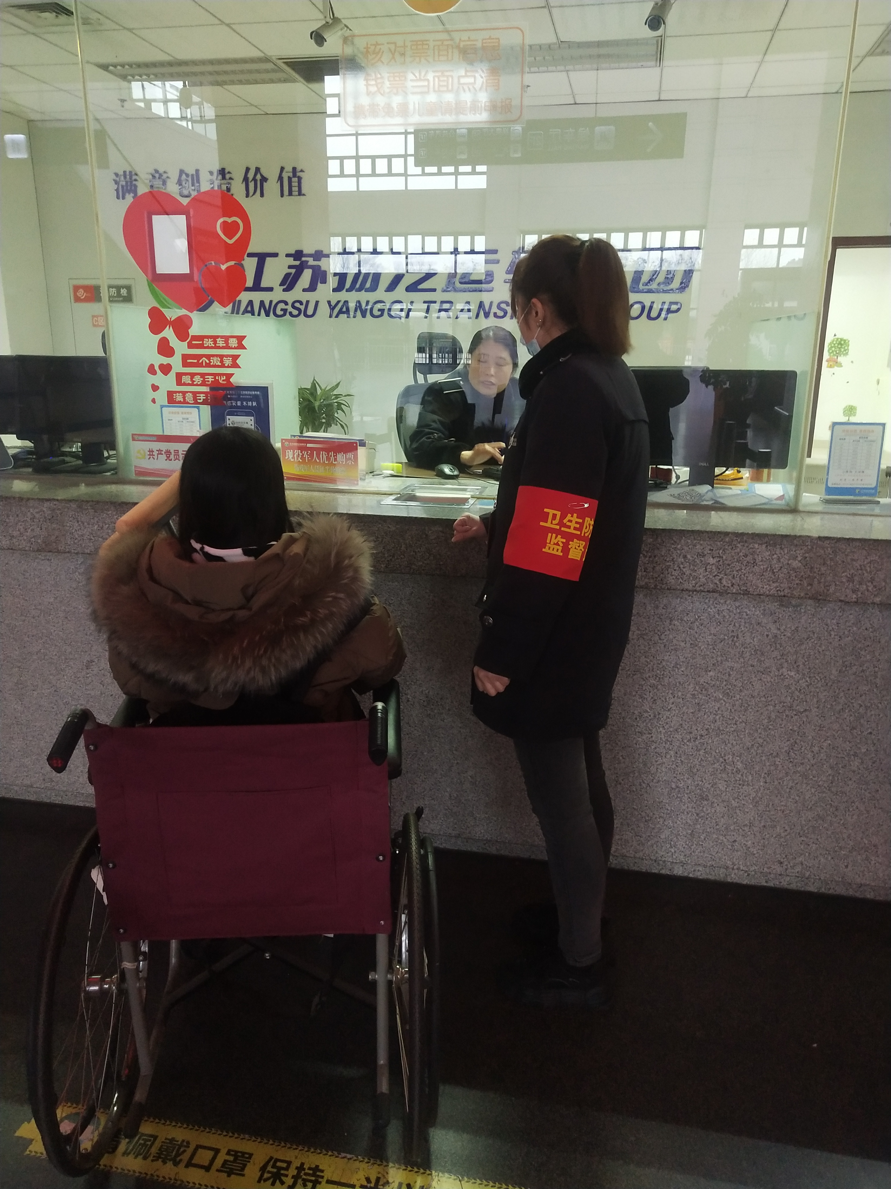 周俊云班長(zhǎng)讓她稍等會(huì),就幫她推來(lái)了車站里提供的輪椅,讓她坐在輪椅上面推她去售票窗口買(mǎi)票,還很熱心的一直送到重點(diǎn)旅客無(wú)障礙直升電梯里面,然后再送到二樓檢票口,直到幫助這位旅客上了車,臨走前還對(duì)旅客說(shuō)一句一路順風(fēng)。