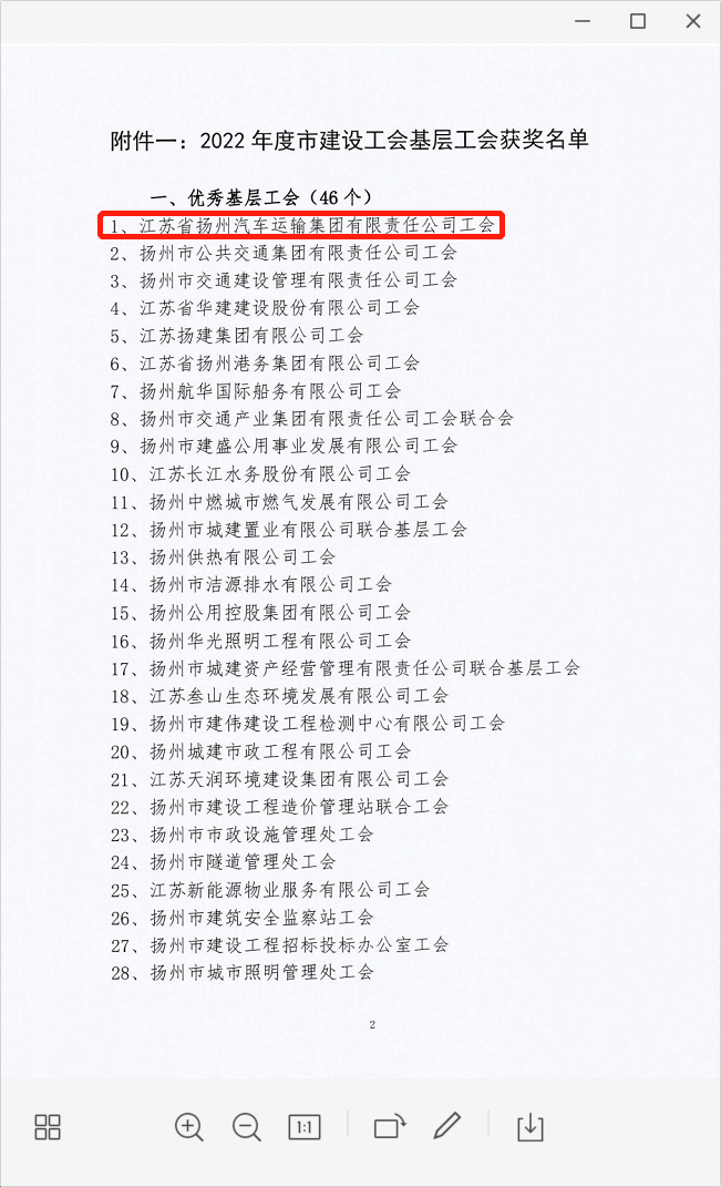 揚汽集團工會榮獲揚州建設(shè)產(chǎn)業(yè)工會“優(yōu)秀基層工會”通報表彰