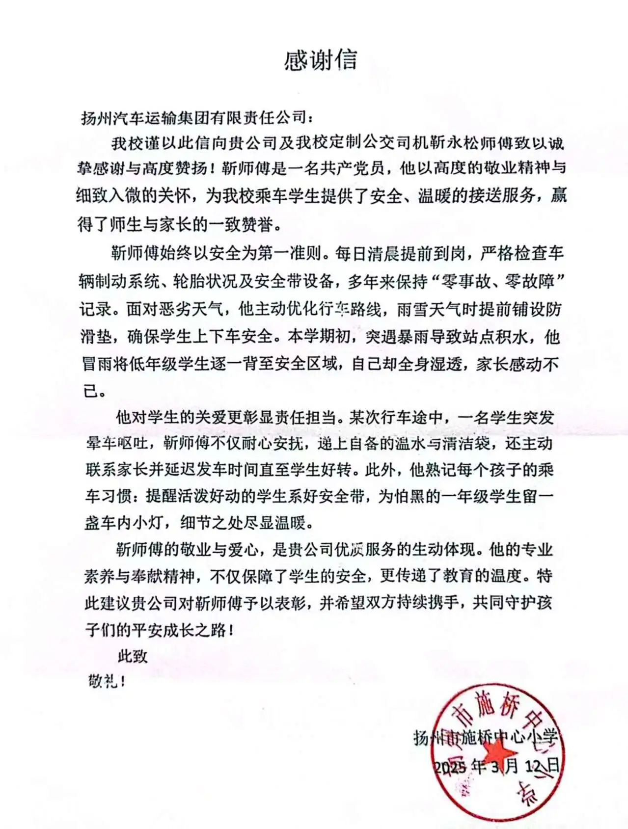 紙短情長 愛有回響丨揚(yáng)汽集團(tuán)校車司機(jī)優(yōu)質(zhì)服務(wù)獲學(xué)校點(diǎn)贊